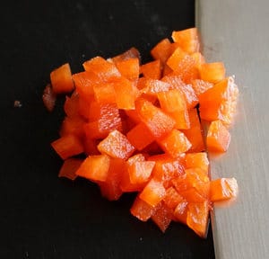 - 1 cuillère à soupe de brunoise de poivrons étuvée (on taille un morceau de poivron rouge en petits cubes que l’on fait cuire sans ajout de matière grasse pendant plusieurs minutes)
