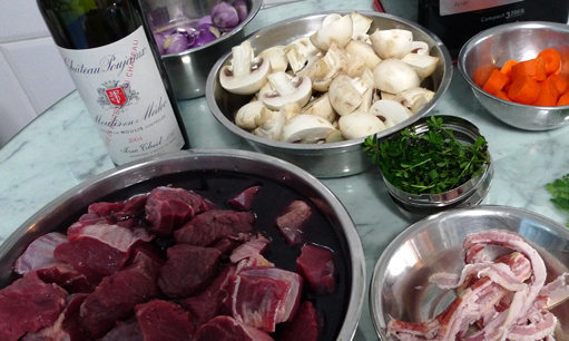 - La veille, faire mariner la viande de boeuf avec sa garniture dans le vin rouge (choisir un morceau de gîte, paleron ou macreuse découpé en cubes de 40 g environ).